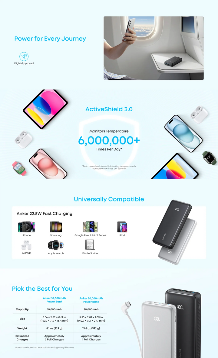 نال باور بانك Anker Zolo 20K إعجاب المستخدمين بفضل سعة بطاريته الكبيرة وقدرته على شحن الأجهزة المتعددة بشكل متواصل وسريع. تصميمه النحيف والكابل المدمج يجعل حمله سهلاً ومريحًا أثناء السفر أو الاستخدام اليومي، بينما تضمن ميزة الشحن المتزامن وبطارية 20,000 ملّي أمبير تجربة شحن مستمرة وموثوقة في أي مكان. يُعتبر هذا الباور بانك خيارًا مثاليًا لمن يبحث عن قوة شحن عالية، أمان، وراحة في الاستخدام اليومي.