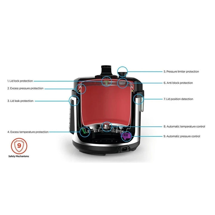- 9 آليات أمان مدمجة: تشمل صمامات تحرير البخار المزدوجة، حماية من الضغط الزائد والسخونة الزائدة، بالإضافة إلى إيقاف التشغيل التلقائي لراحة البال الكاملة.