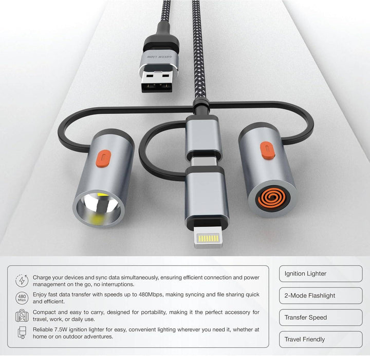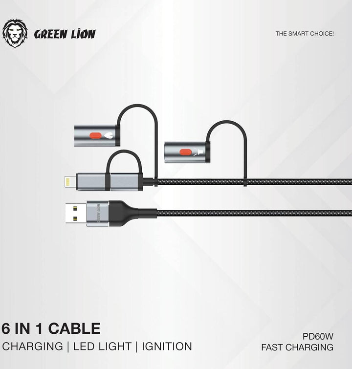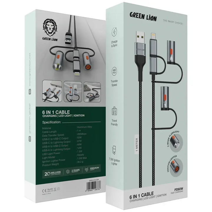 Green Lion 6 in1 Cable Charging Led Light Ignition PD 60W Black - كيبل 6 في 1 بقوة 60 واط مع اضاءة وقداحة من كرين اسود