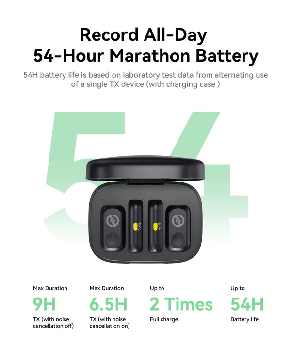 - بطارية طويلة المدى: كل وحدة إرسال تعمل حتى 9 ساعات (6.5 ساعات مع تفعيل إلغاء الضوضاء)، ومع علبة الشحن يمكن التبديل بين وحدتي الإرسال للحصول على حتى 54 ساعة من التسجيل المتواصل.