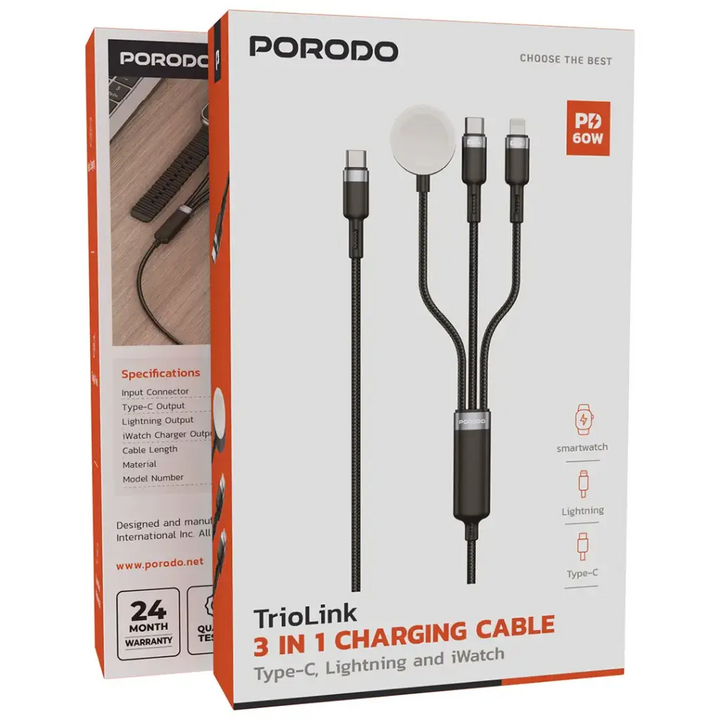 كابل بورودو 3 في 1 للشحن Type-C وLightning وiWatch بقوة 60 وات – Porodo 60W C to C+L+Watch Charger