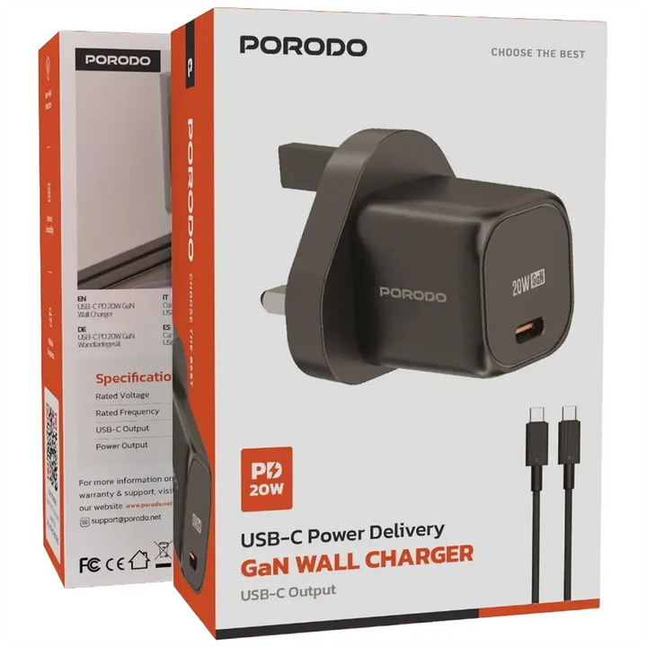 Porodo PD 20W UK Fast Charger with C to C Cable – Black