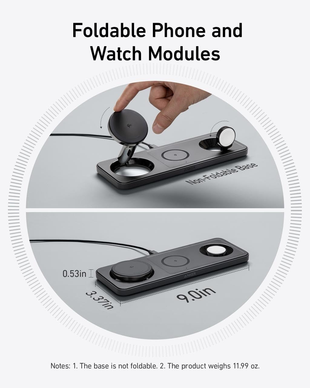 قابل للتعديل وموفر للمساحة: يتميز بتصميم نحيف وموفر للمساحة مع وحدة هاتف يمكن تعديلها من 90 درجة إلى 180 درجة، مما يلبي كل من ساعة Apple وiPhone الخاصة بك.