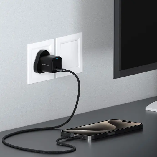 Powerology 35W PD QC 1xUSB-C 35W and 1xUSB-A 18W GaN Charger UK with USB-C TO Lightning Cable Black - شاحن تايب سي 35 واط مع كيبل تايب سي ايفون من باورولوجي اسود