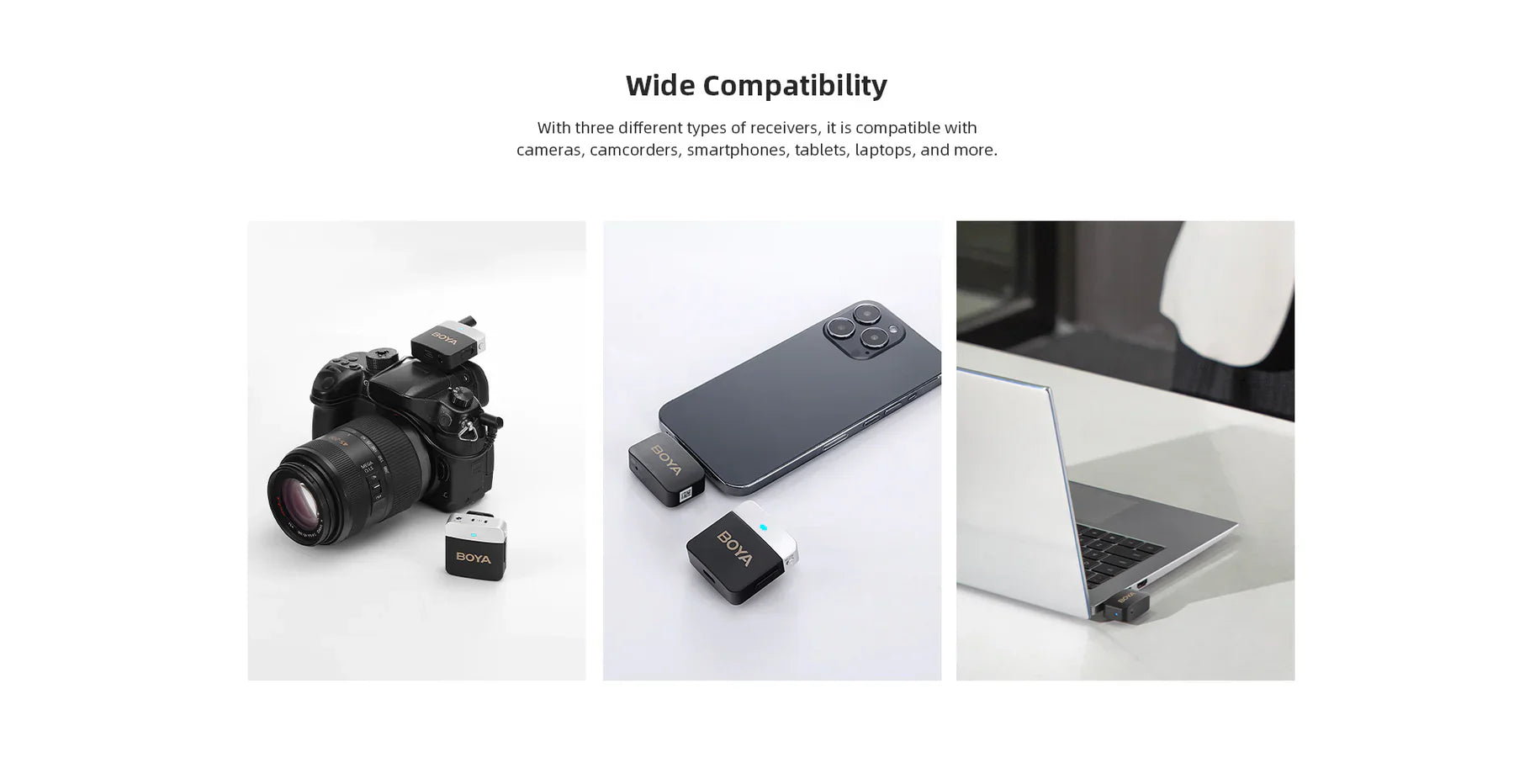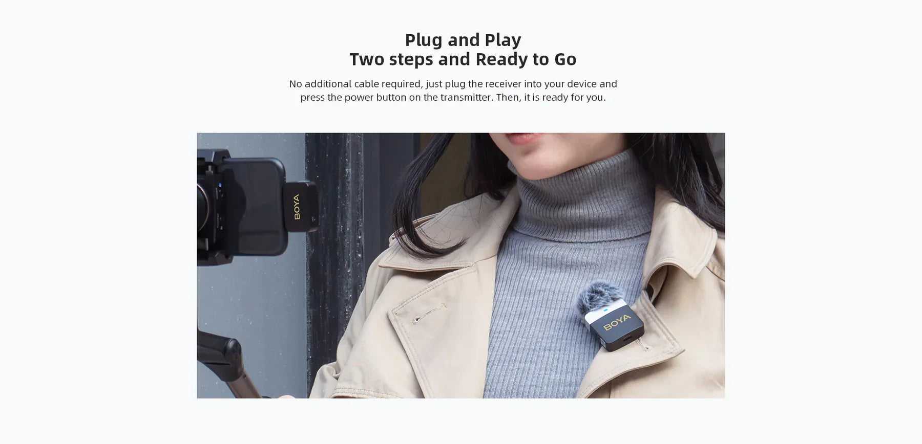 سلسلة BY-M1V عبارة عن نظام ميكروفون لاسلكي خفيف الوزن وسهل الاستخدام يوفر جودة صوت استثنائية لمجموعة من الأجهزة بما في ذلك الهواتف الذكية أو الأجهزة اللوحية أو كاميرات DSLR أو كاميرات الفيديو. إنها مثالية للبث المباشر أو إنشاء المحتوى أو صحافة الهاتف المحمول. يتميز BY-M1V5 بمنفذ RXD، وهو متوافق مع أجهزة Apple iOS.