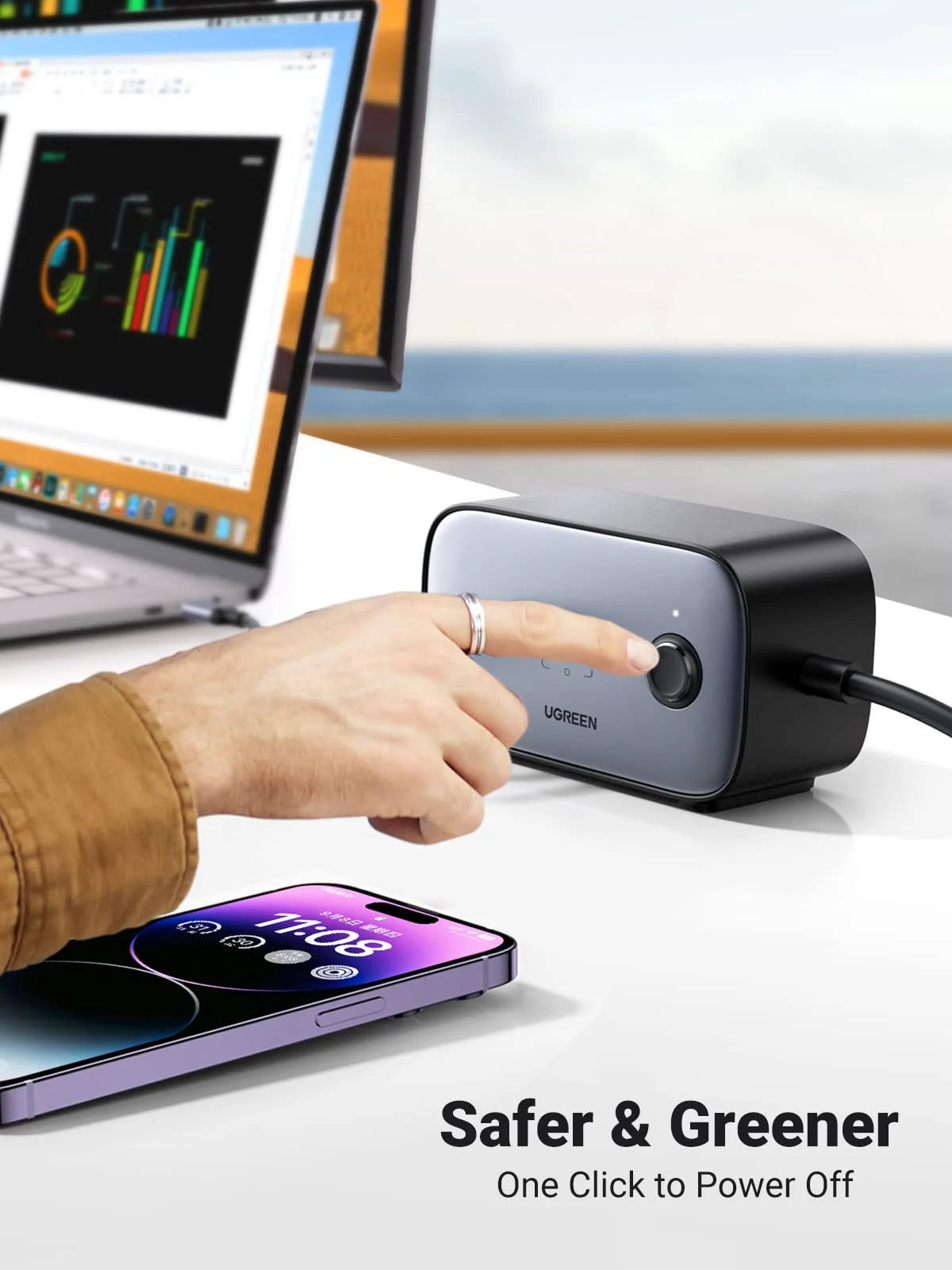 يوفر شاحن UGREEN Power Strip GaN حلاً ذكيًا ومتكاملًا لشحن جميع أجهزتك من مكان واحد، بقدرة إجمالية تصل إلى مع منافذ USB-C وUSB-A تدعم الشحن السريع حتى 100W. تم تصميمه ليخدم الهواتف، الأجهزة اللوحية، اللابتوبات، وأجهزة الألعاب المحمولة بكفاءة عالية، مع دعم شامل لبروتوكولات الشحن الحديثة مثل PD وQC وPPS لضمان سرعة وأمان مثاليين.