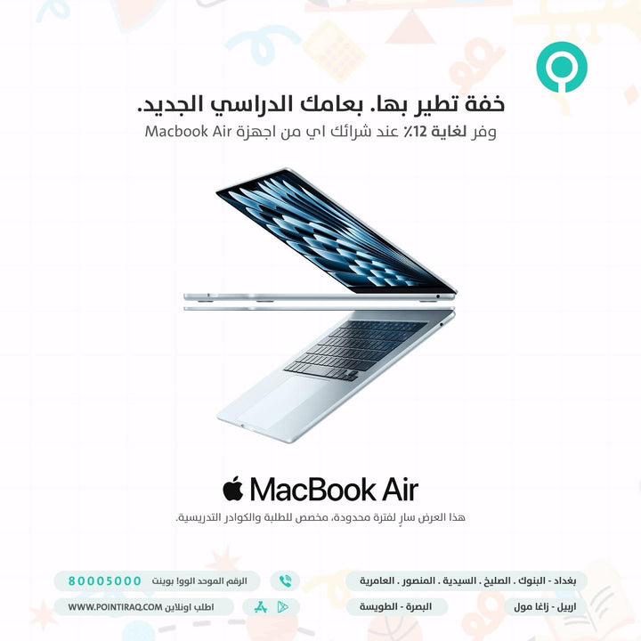 استمتع بقوة الأداء والتقنيات الذكية مع MacBook Air مقاس 13 إنش بمعالج Apple M4، المزود بوحدة معالجة مركزية 10 نوى ووحدة رسومية 10 نوى. يأتي هذا الجهاز بسعة تخزين 512 جيجابايت وذاكرة 16 جيجابايت لتعدد المهام بكفاءة، بالإضافة إلى شاشة Liquid Retina المذهلة بدقة ألوان عالية. تصميمه الفضي الأنيق، مع تقنية Apple Intelligence المتقدمة، يجعل هذا الجهاز خيارًا مثاليًا للمحترفين والمبدعين.