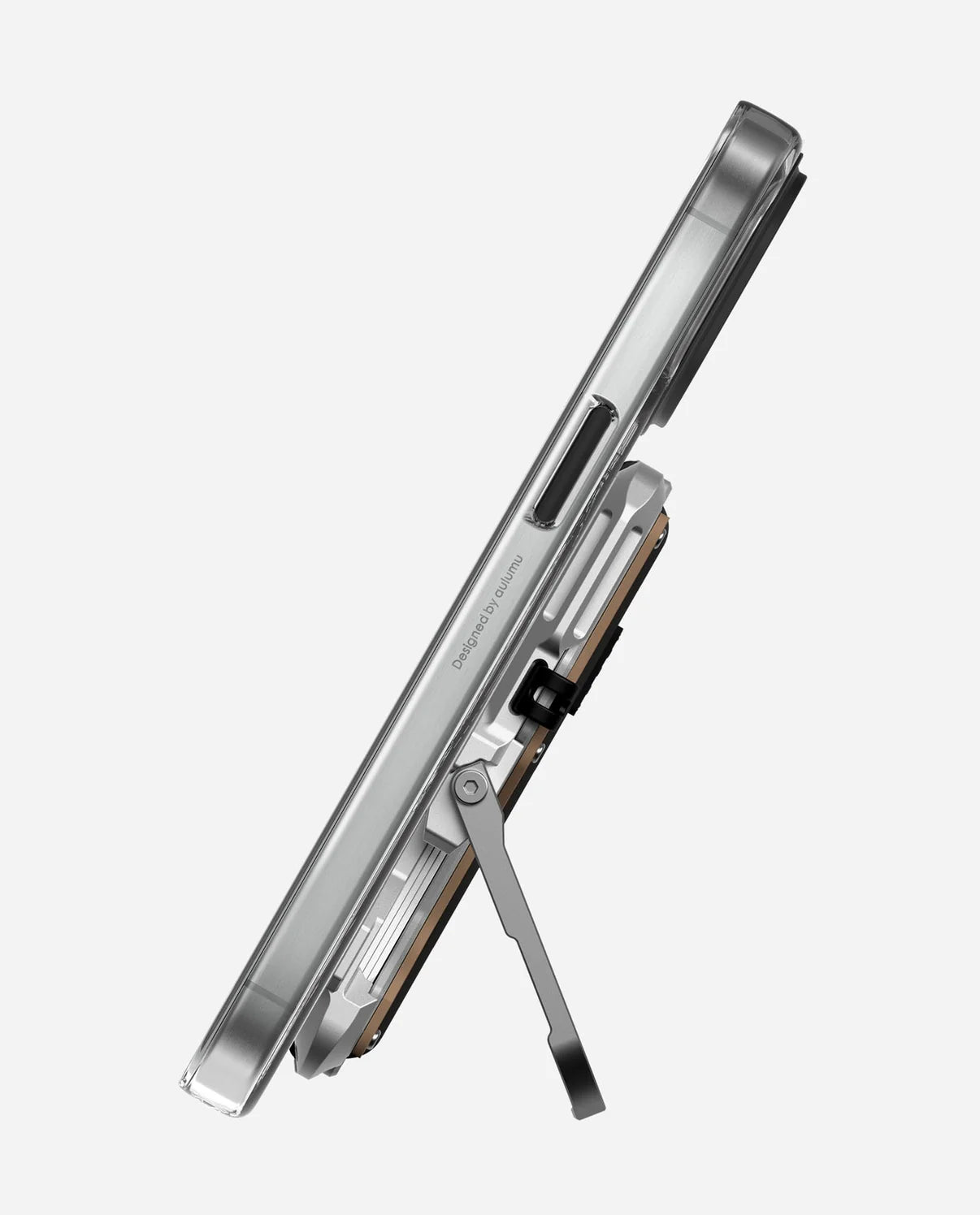محفظة AULUMU G03 Multi-Tool Magnetic Metal Wallet مع غطاء جلد طبيعي باللون البني تجمع بين الأناقة والوظائف العملية في تصميم واحد نحيف وعصري. مصنوعة من هيكل معدني من سبائك الألومنيوم مع غطاء من الجلد الطبيعي الفاخر، وتتميز بمغناطيس قوي متوافق مع MagSafe لتثبيت آمن على الهاتف. تأتي بوزن خفيف حوالي 100 غرام وسماكة رفيعة 9.4 مم، مع أدوات متعددة مدمجة مثل حامل هاتف معدني، حامل AirTag قابل للإزالة، بطاقة حماية RFID، فتاحة زجاجات ومسطرة صغيرة، ما يجعلها إكسسوار يومي متكامل.