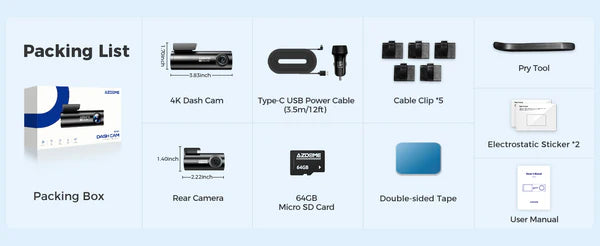 Azdome Dash Cam M300S 2 Channel 4K with 64GB TF card - كاميرا سيارة امامية 4K وخلفية 1080 مع واي فاي وGPS وكرت 64GB من ازدوم