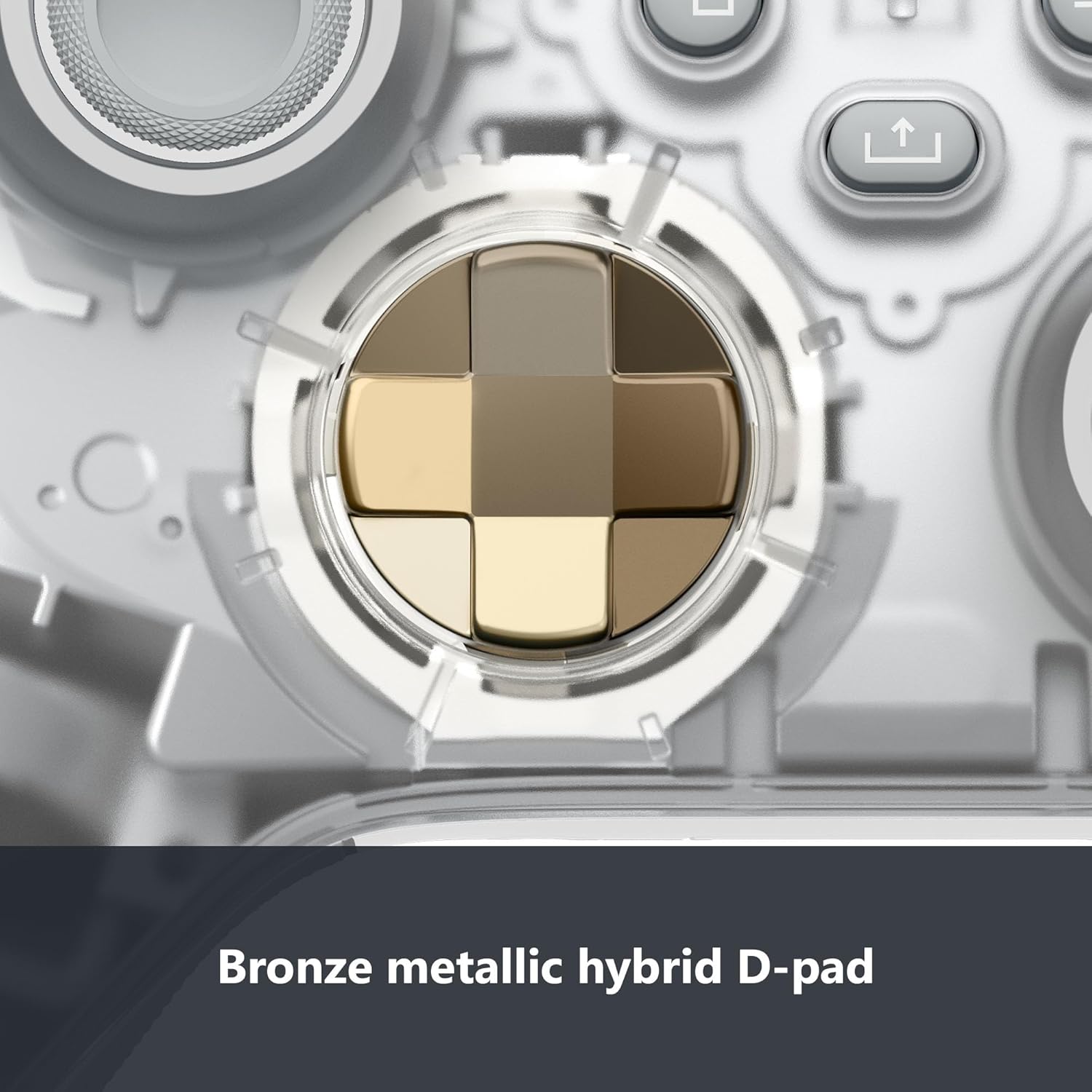 وحدة تحكم Xbox Series Ghost Cipher تقدم تجربة لعب متميزة مع تصميم شفاف أنيق يكشف عن الأجزاء الداخلية المعدنية الفضية، مع لمسات معدنية على الزرار والمحركات لتوفير مظهر عصري وجذاب. تتميز المقابض الخلفية المطاطية باللون الرمادي الرملي براحة عالية أثناء اللعب الطويل، بينما تساعدك المحركات والـ D-pad المعدنية البرونزية على البقاء دقيقًا في التحكم باللعبة. كما يتيح زر Share المدمج التقاط ومشاركة لقطات الشاشة والفيديوهات بسهولة.