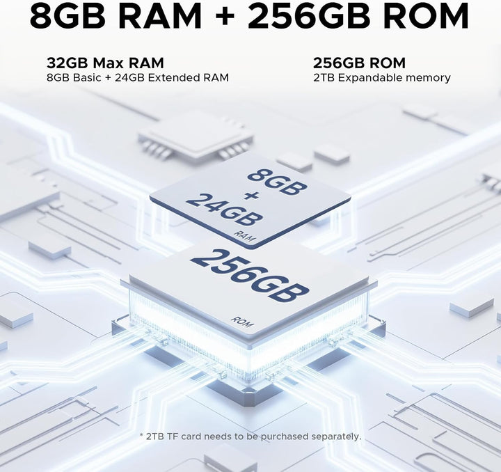 - الذاكرة والتخزين: 256GB تخزين داخلي + 8GB RAM، يدعم microSDXC
