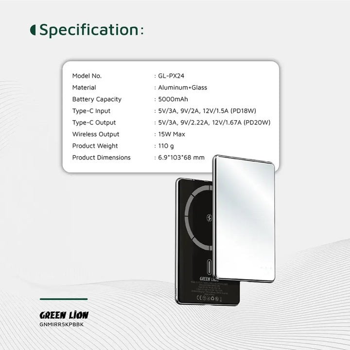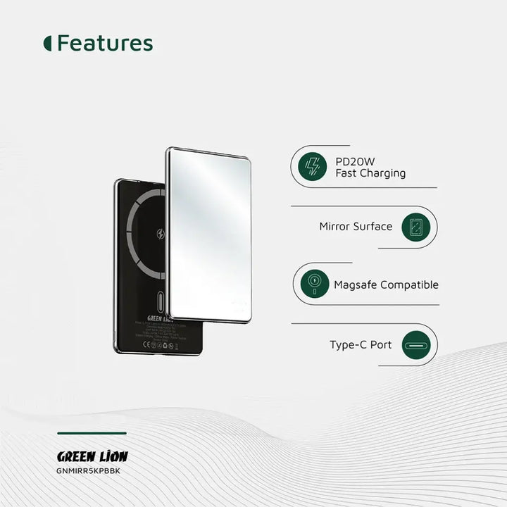 اسم المنتج بالإنجليزية: Green Lion Mirror Design 5000mAh Power Bank PD 20W - Black
