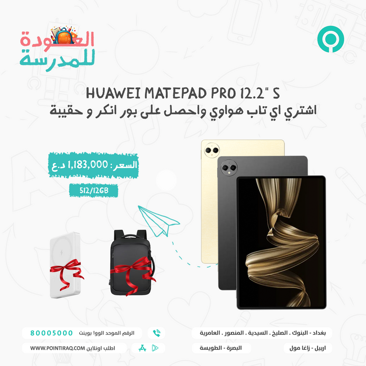 ارتقِ بتجربة الإنتاجية والترفيه مع جهاز HUAWEI MatePad Pro 12.2" S Wifi 12+512GB باللون الأسود الأنيق، الآن مع لوحة مفاتيح، قلم، وفأرة لتجربة استخدام متكاملة. يتميز الجهاز بشاشة كبيرة مقاس 12.2 بوصة بدقة 2800x1840 بيكسل لتجربة مشاهدة واضحة ومذهلة، مع معالج قوي Kirin 9000S يضمن أداء سلس وسريع. تأتي البطارية بسعة 10100 مللي أمبير/ساعة مع دعم الشحن السريع 100 واط، إلى جانب ذاكرة داخلية 512 جيجابايت وذاكرة عشوائية 12 جيجابايت لتعدد المهام وتخزين كبير للملفات والتطبيقات. يدعم الجهاز كاميرا أمامية بدقة 16 ميجابكسل وخلفية 13 ميجابكسل لتصوير واضح واحترافي.