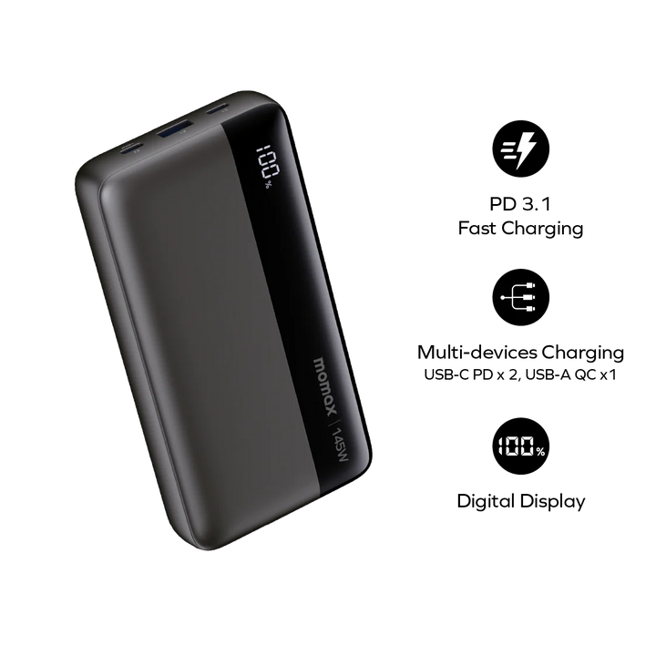 باور بنك Momax Power 25000mAh PD145W هو الحل الأقوى لشحن أجهزتك أثناء التنقّل، بفضل قدرته الفائقة على توفير شحن سريع يصل إلى 145W عبر تقنية PD 3.1 وسعته الضخمة البالغة 25000mAh. يسمح لك هذا الجهاز بشحن الهواتف الذكية، أجهزة التابلت، وحتى أجهزة MacBook وWindows Laptop بكفاءة عالية، مع إمكانية شحن ثلاثة أجهزة في وقت واحد. يأتي بتصميم متين من مواد مقاومة للحريق وشاشة رقمية توضح نسبة البطارية.