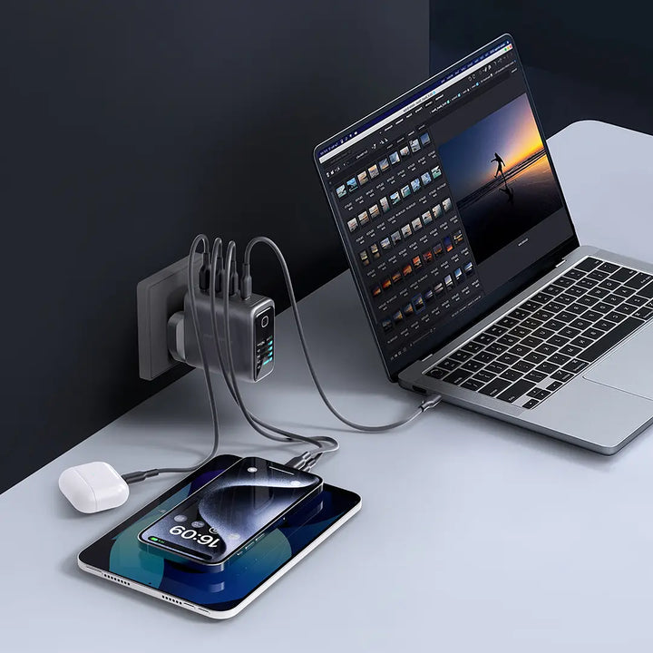 - توزيع طاقة ذكي يضمن شحن كل جهاز بأمان وكفاءة.