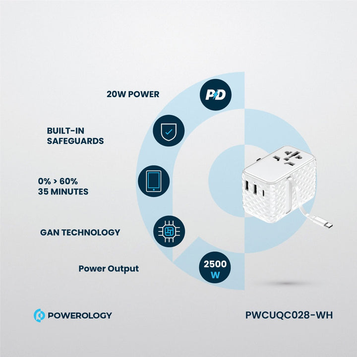 يُعتبر Powerology Universal Adapter الحل الأمثل للمسافرين ولأصحاب الأجهزة المتعددة، حيث يجمع بين شحن سريع وموثوق لجميع أجهزتك. يأتي مع كابل Type-C مدمج قابل للسحب بقدرة 20 واط، واثنين من منافذ USB-A بقدرة 15 واط لكل منهما، ما يتيح شحن حتى ثلاثة أجهزة في وقت واحد بكفاءة عالية. بفضل توافقه مع أكثر من 150 دولة، يمكنك استخدامه أثناء السفر براحة واطمئنان. كما يحتوي الشاحن على صمامات حماية مدمجة وزائد أمان إضافي لضمان حماية أجهزتك من الشحن الزائد والحرارة.