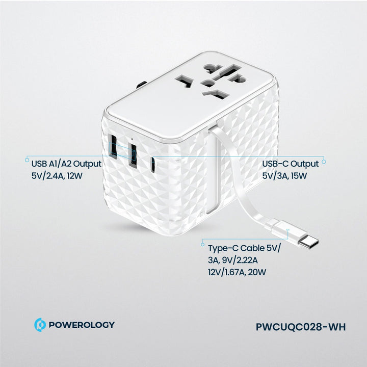 Powerology Universal Adapter PD 20W Type C port and 2XUSB A 15W port with Attached White - شاحن سفر عالمي 20 واط مع كيبل تايب سي مدمج قابل للسحب من باورولوجي ابيض